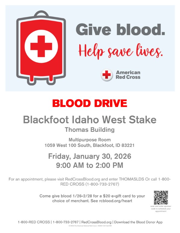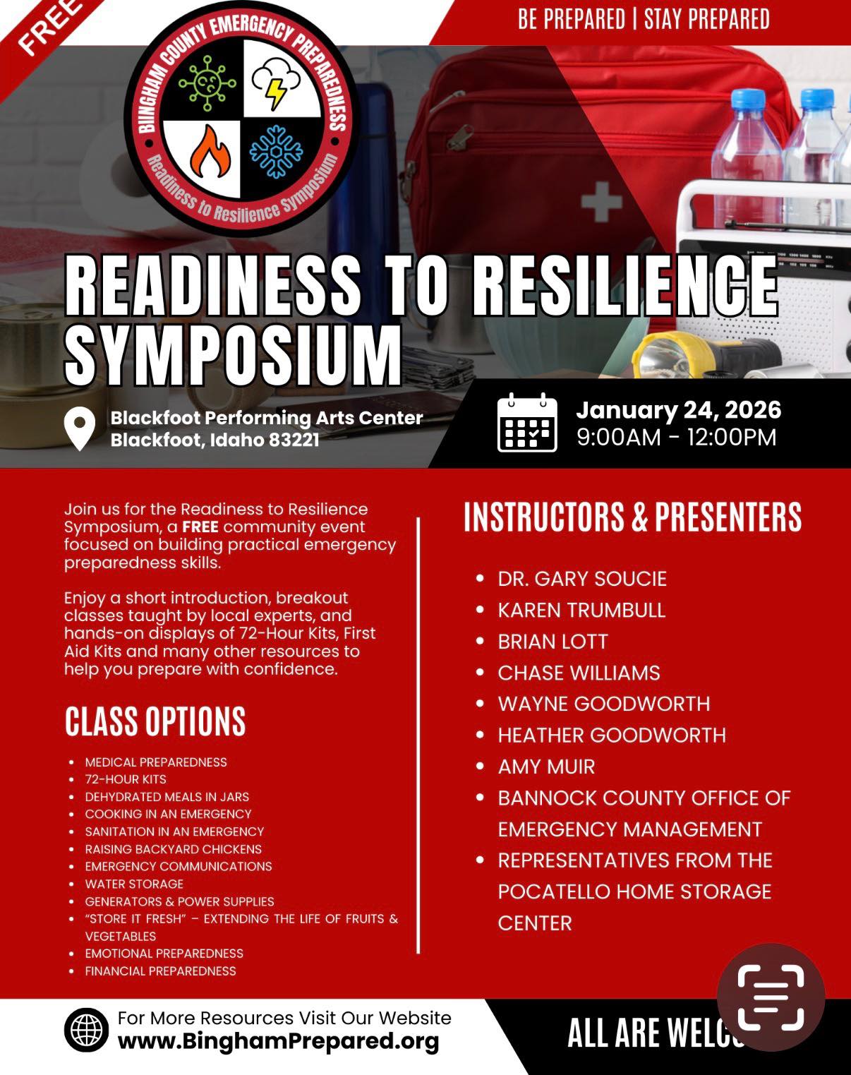 Be prepared. Stay prepared. Join us for the Readiness to Resilience Symposium, a FREE community event focused on building practical emergency preparedness skills. Blackfoot Performing Arts Center January 24, 2026 9:00 AM–12:00 PM Learn from local experts through breakout classes and hands-on displays covering topics like 72-hour kits, medical and emotional preparedness, water storage, emergency […] |